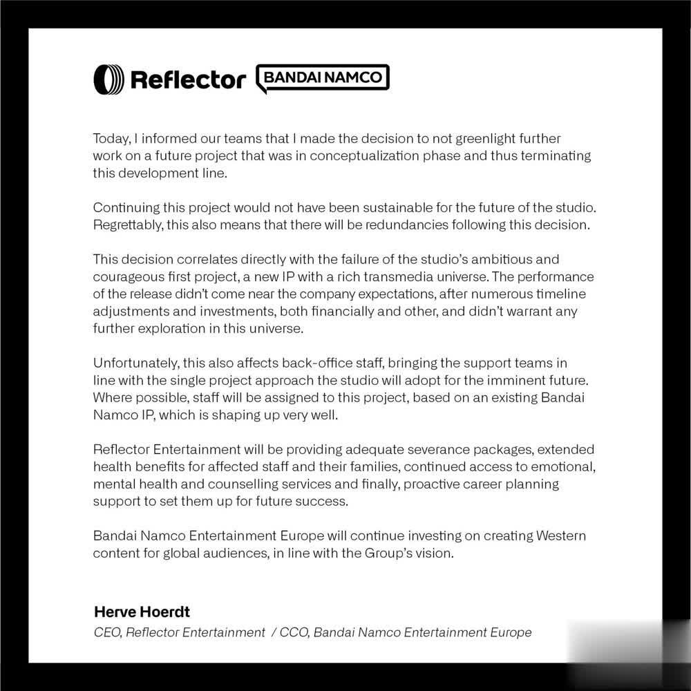 根据Reflector Entertainment发布的一份公告,官方已经取消了所有处于概念状态的新原创游戏项目,同时将进一步裁员。Reflector Entertainment的首席执行官兼万代南梦宫娱乐欧洲首席运营官Herve Hoerdt称这个决定与工作室雄心勃勃与充满勇气的第一个项目《无名九使:觉醒》失败有直接关系。虽然官方没有公开裁员规模,但是根据消息人士称,Reflector Entertainment的本次裁员涉及QA、营销、艺术和叙事部门。